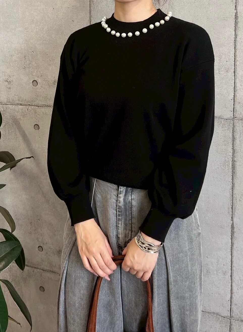 衿ぐりにあしらわれたパールが、まるでネックレスをしているような上品な印象のニットトップス♬