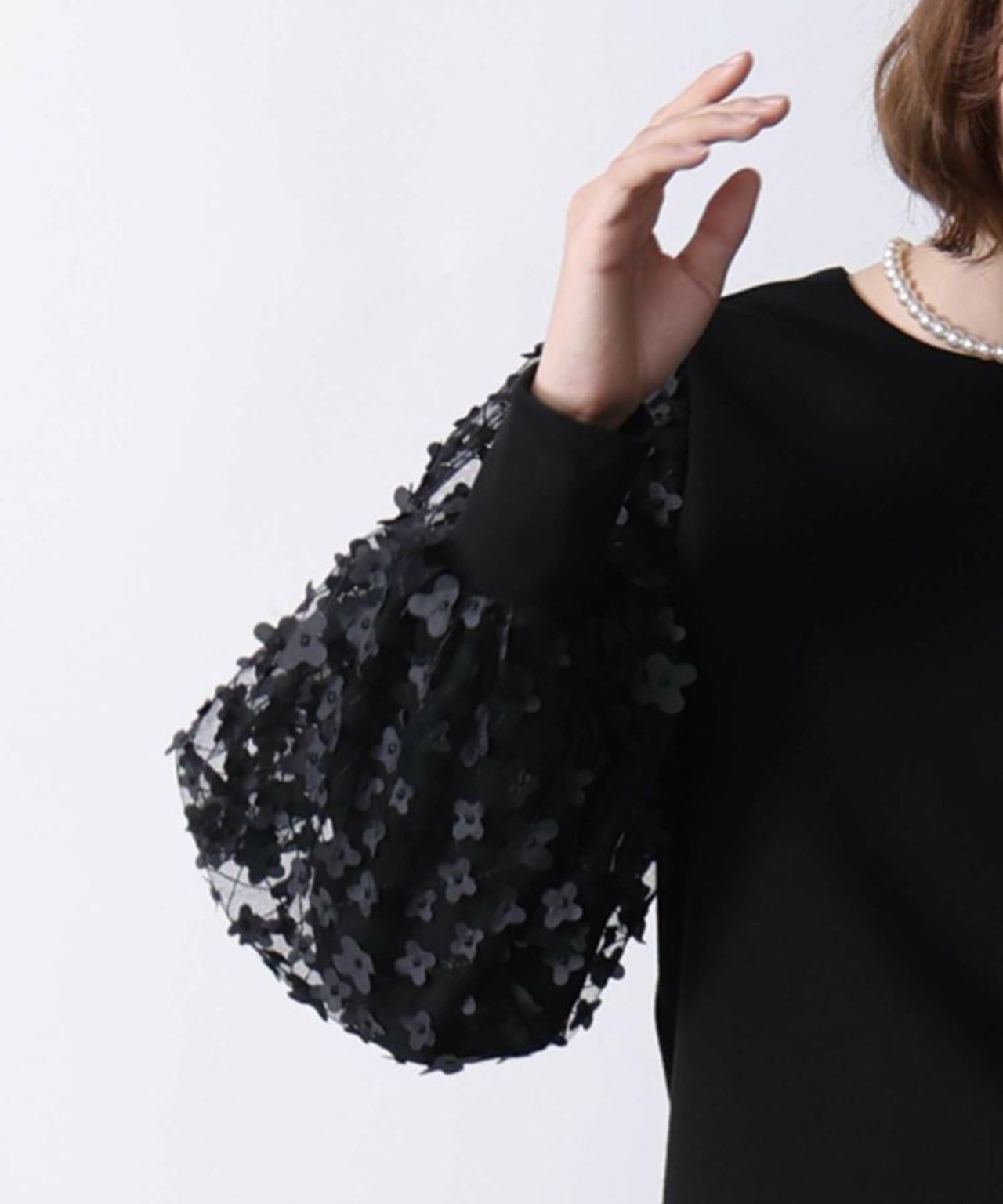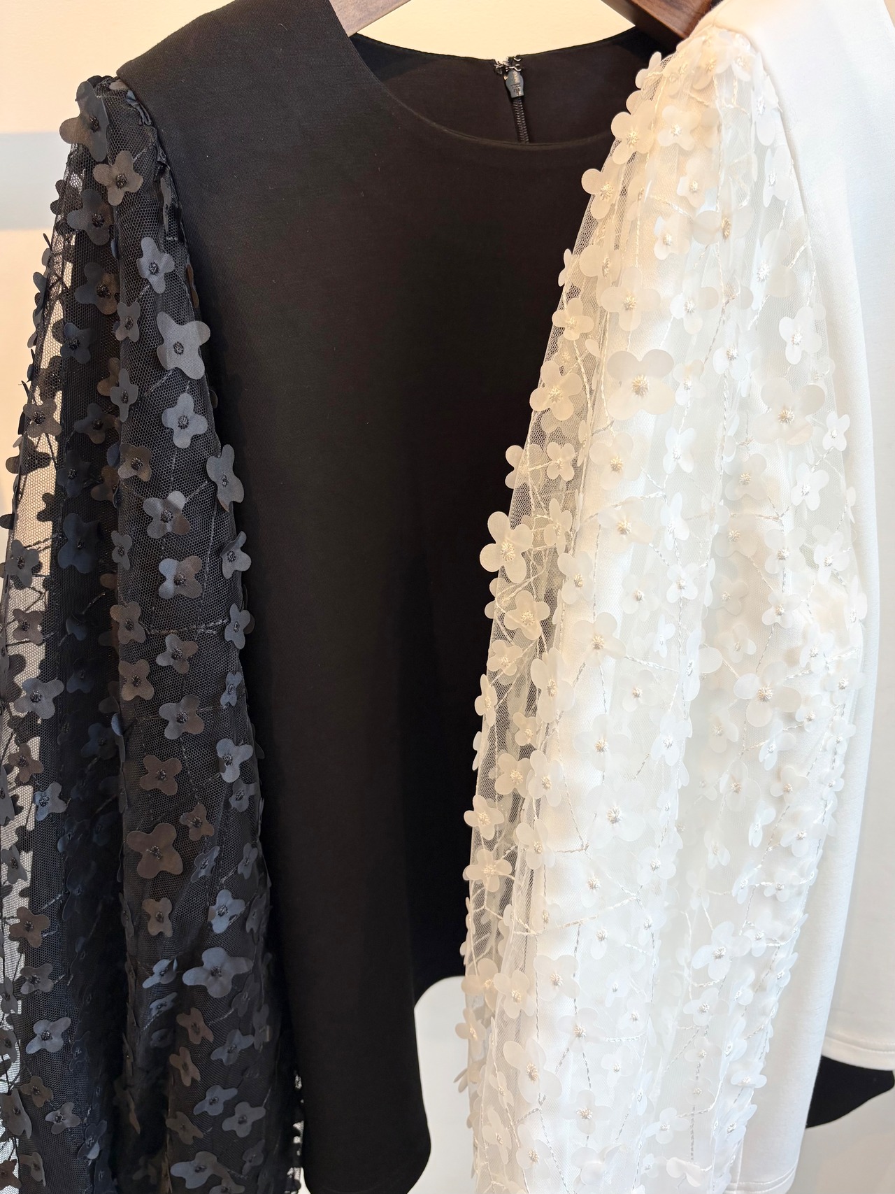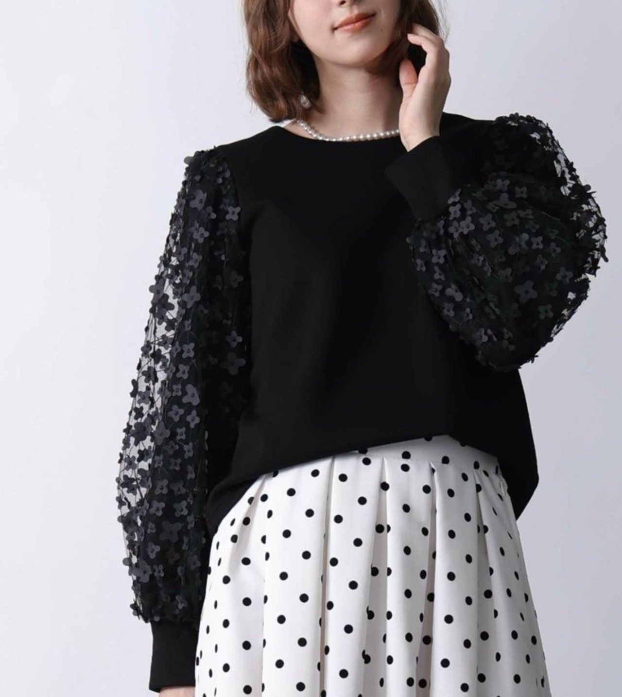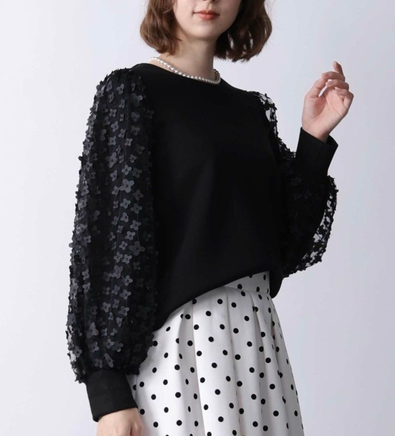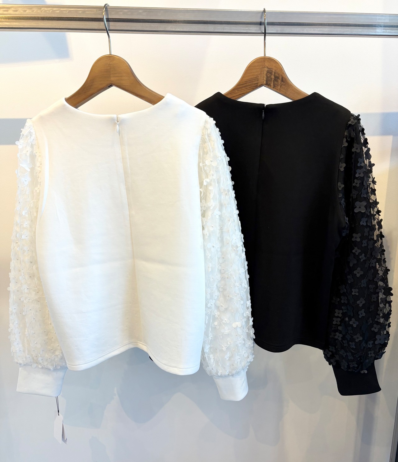 袖にふわりと重ねられたチュールに、刺繍や異素材のフラワーモチーフが散りばめられたプルオーバー✨