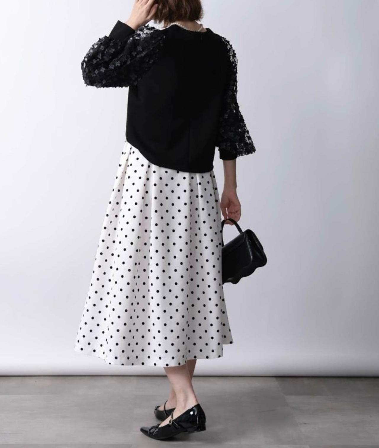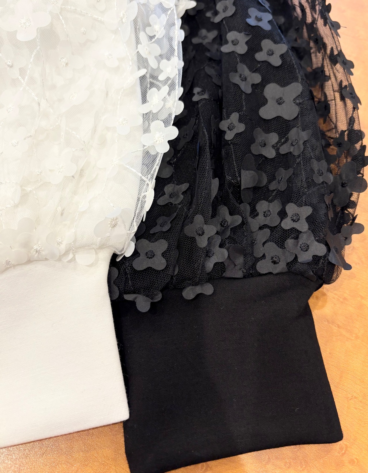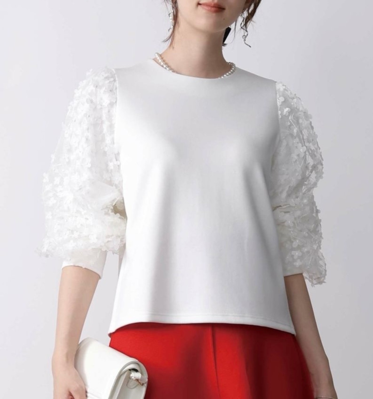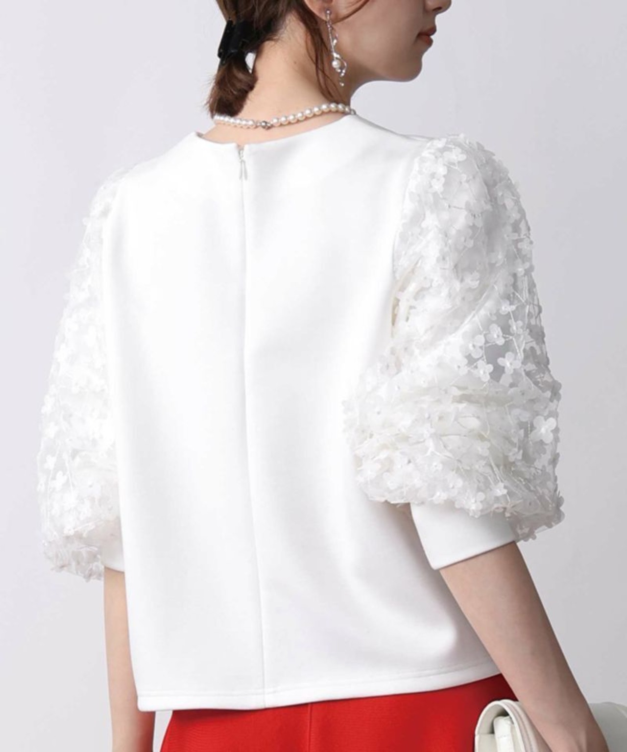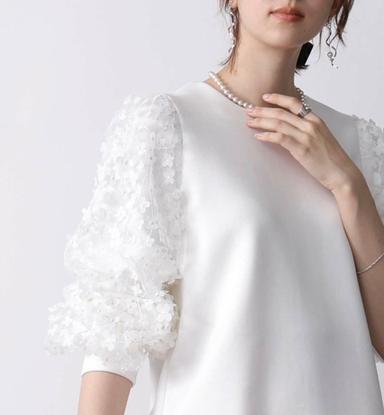 袖にふわりと重ねられたチュールに、刺繍や異素材のフラワーモチーフが散りばめられたプルオーバー✨