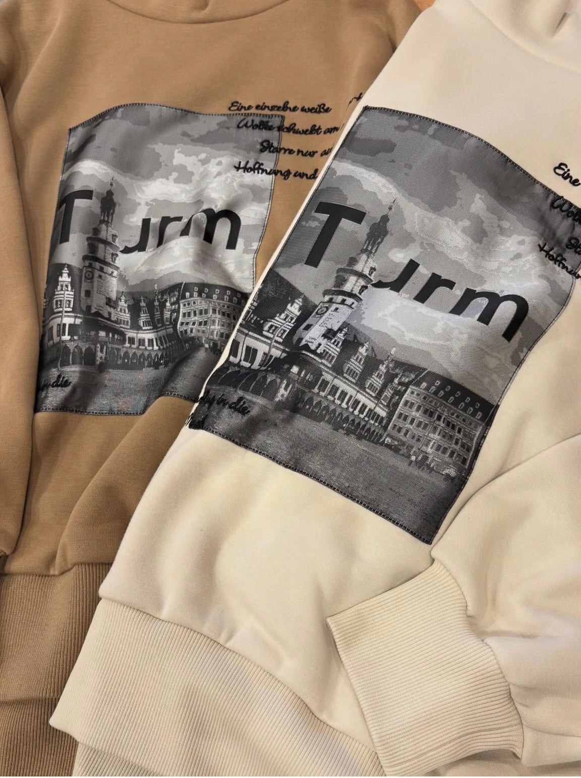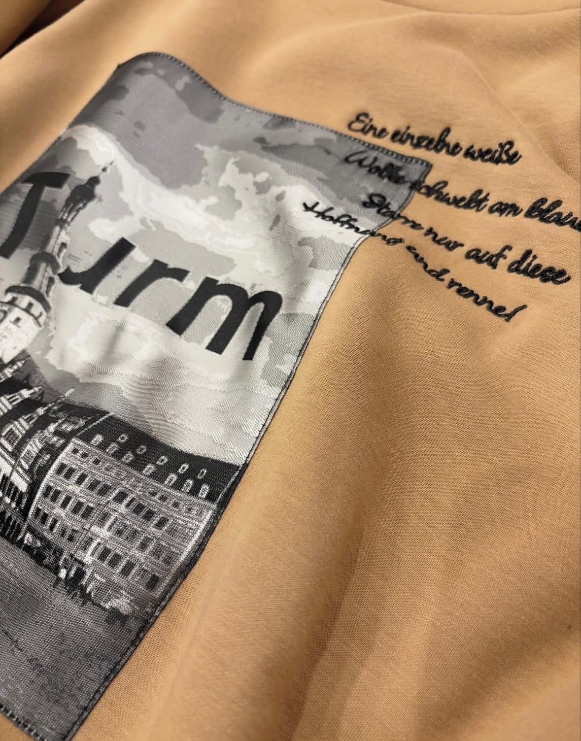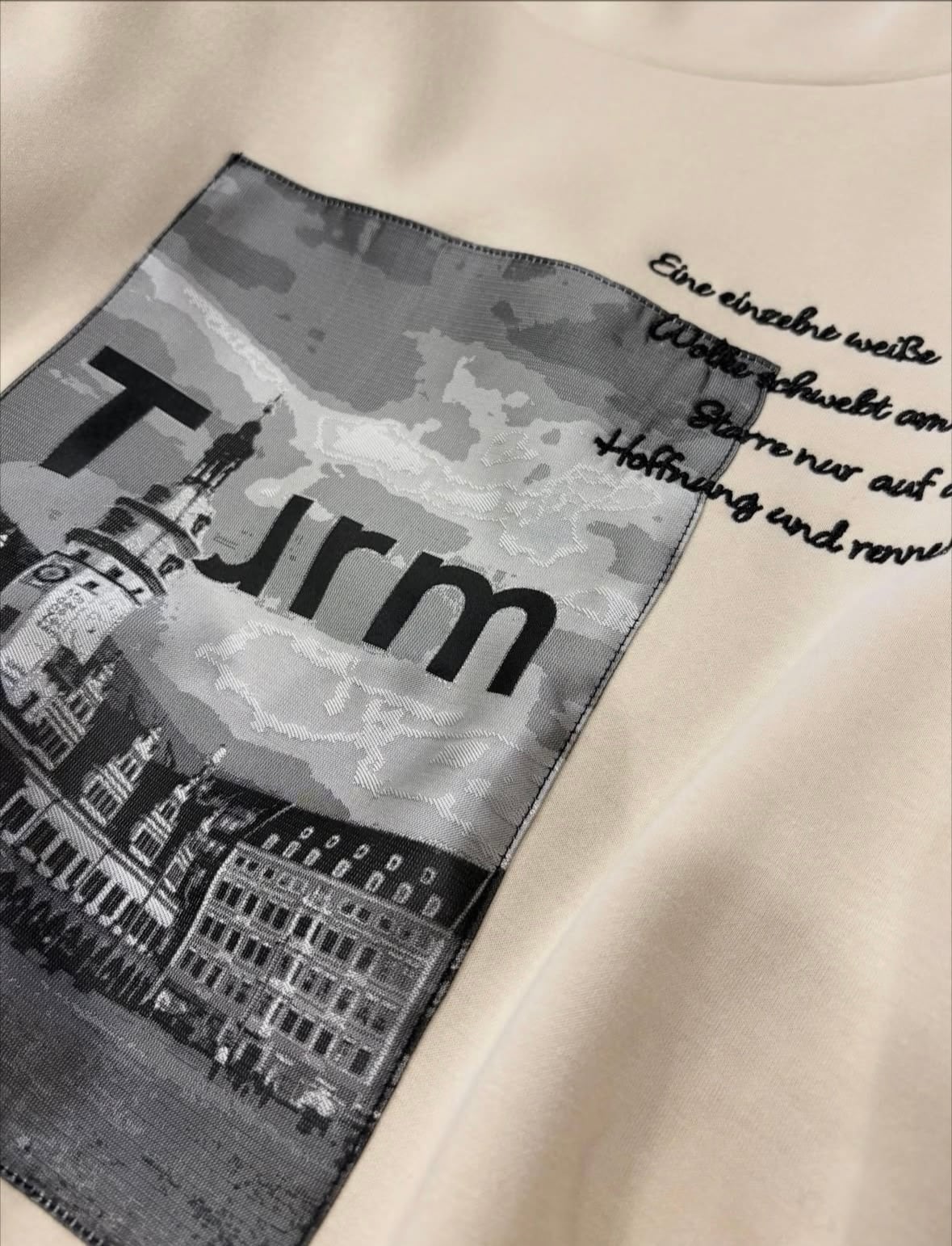 風景写真をジャガード生地で表現してパッチワークに貼り付けロゴをあしらったプルオーバー✨