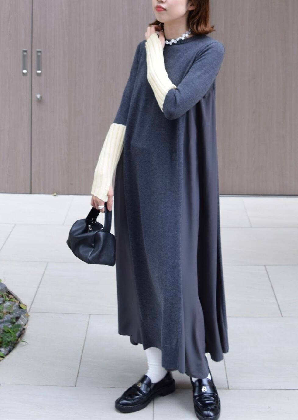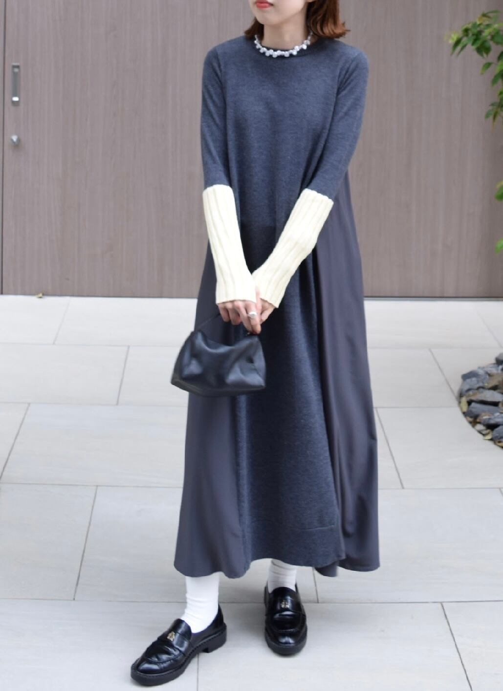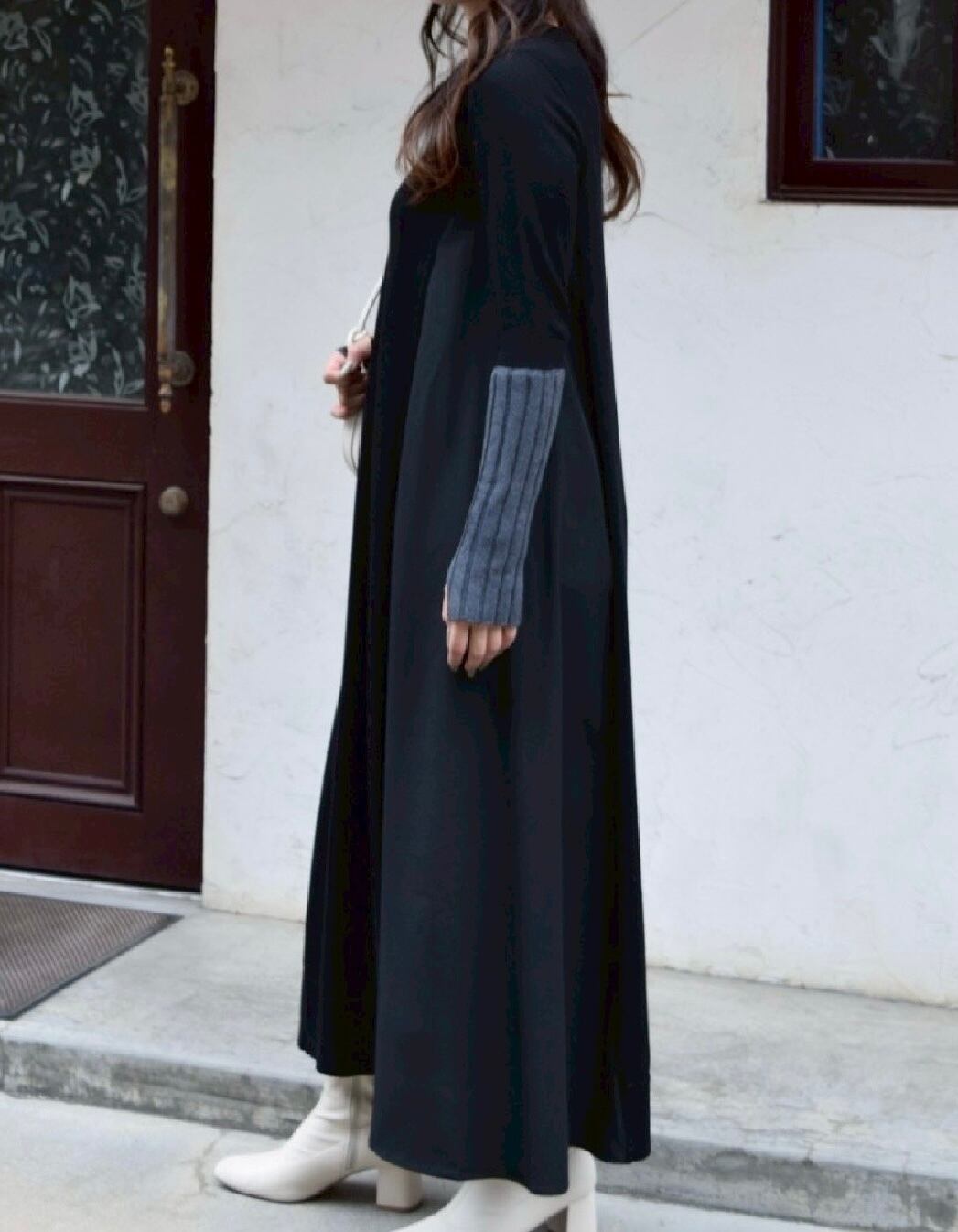 身頃の切り替えは着やせ効果抜群のドッキングデザイン、袖口は配色で指ぬきのグローブ風のワンピース✨