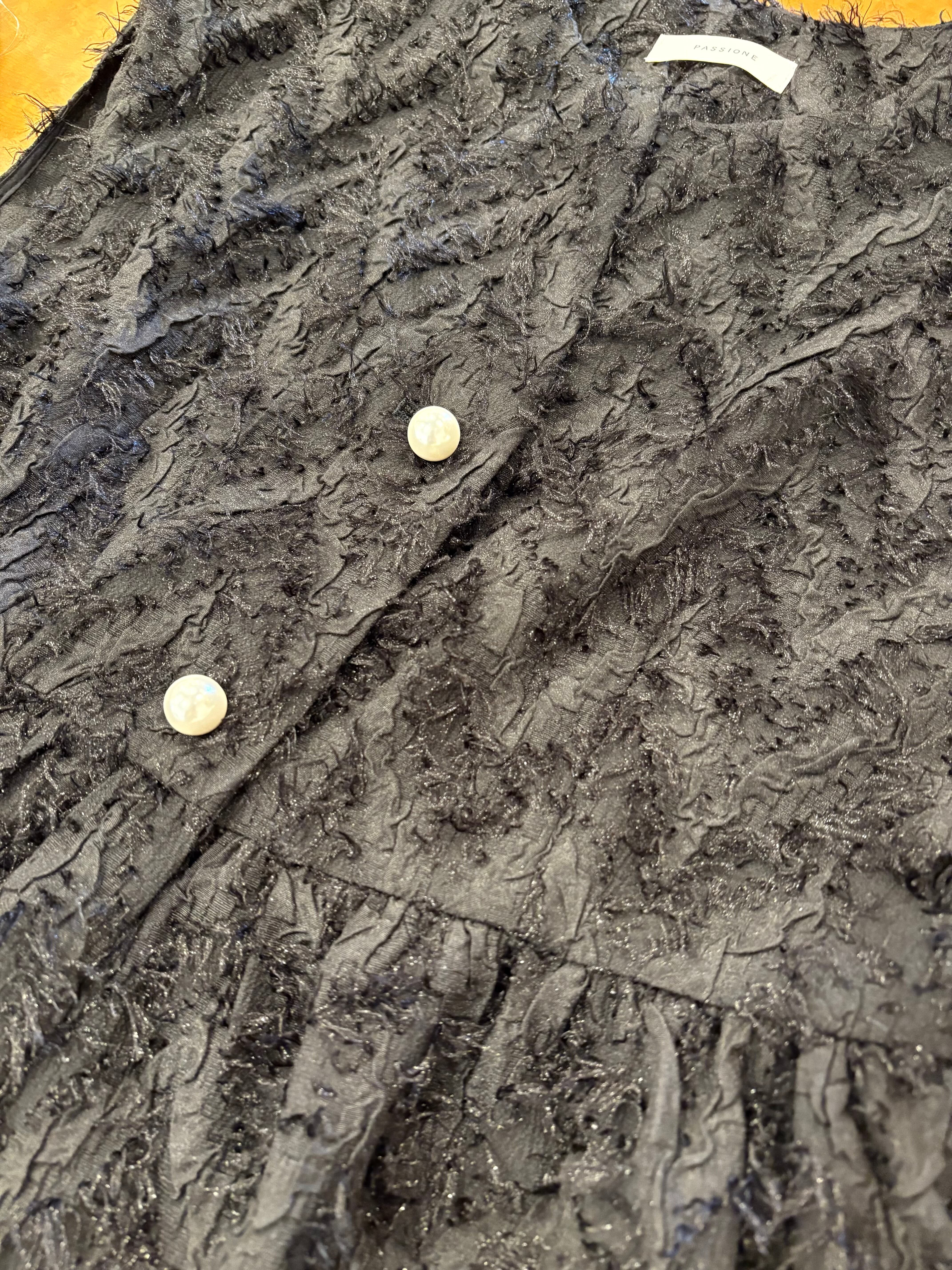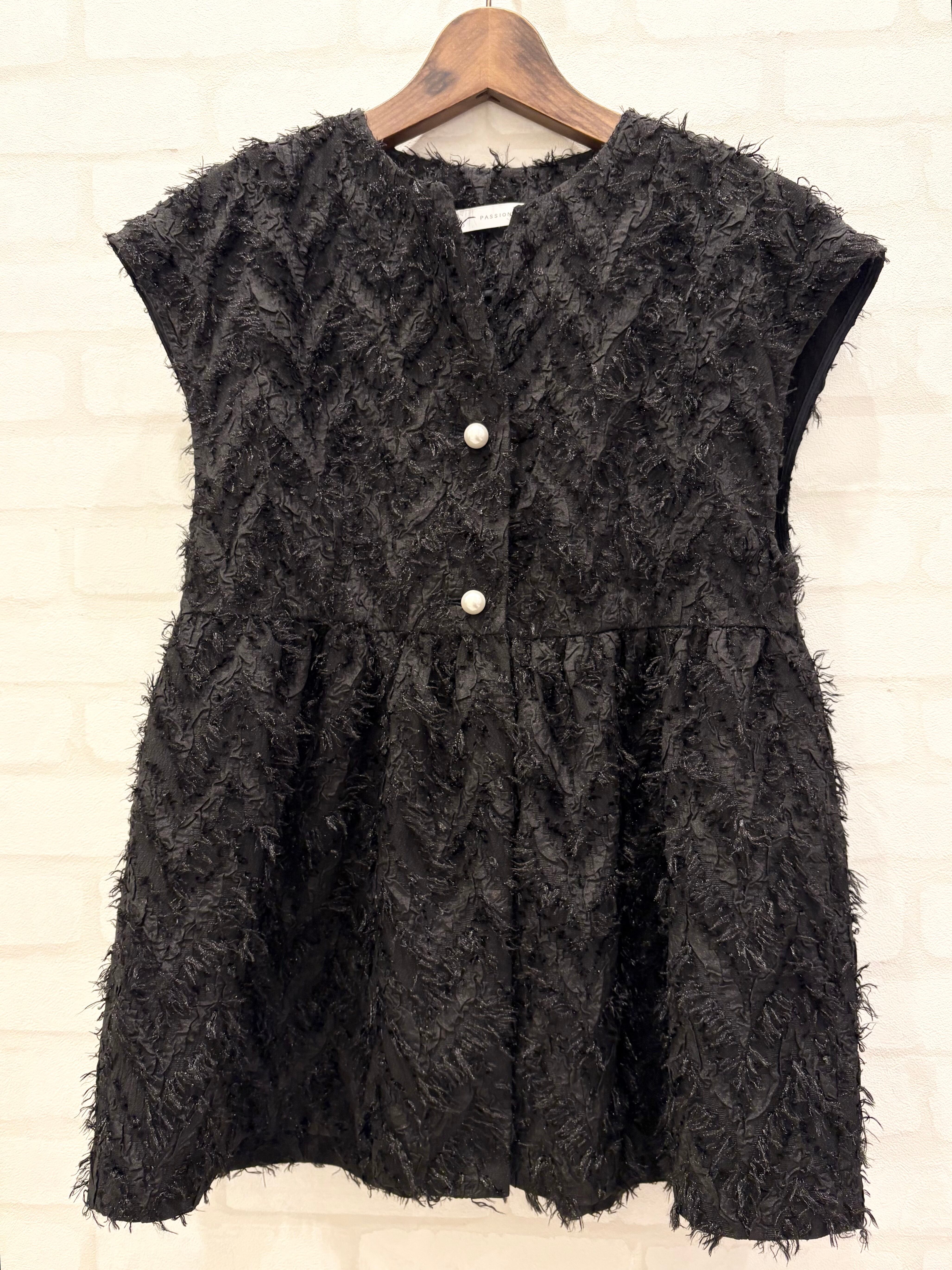 立体感のあるフリンジジャカード素材が目を惹く、存在感抜群のパールボタンジレ✨