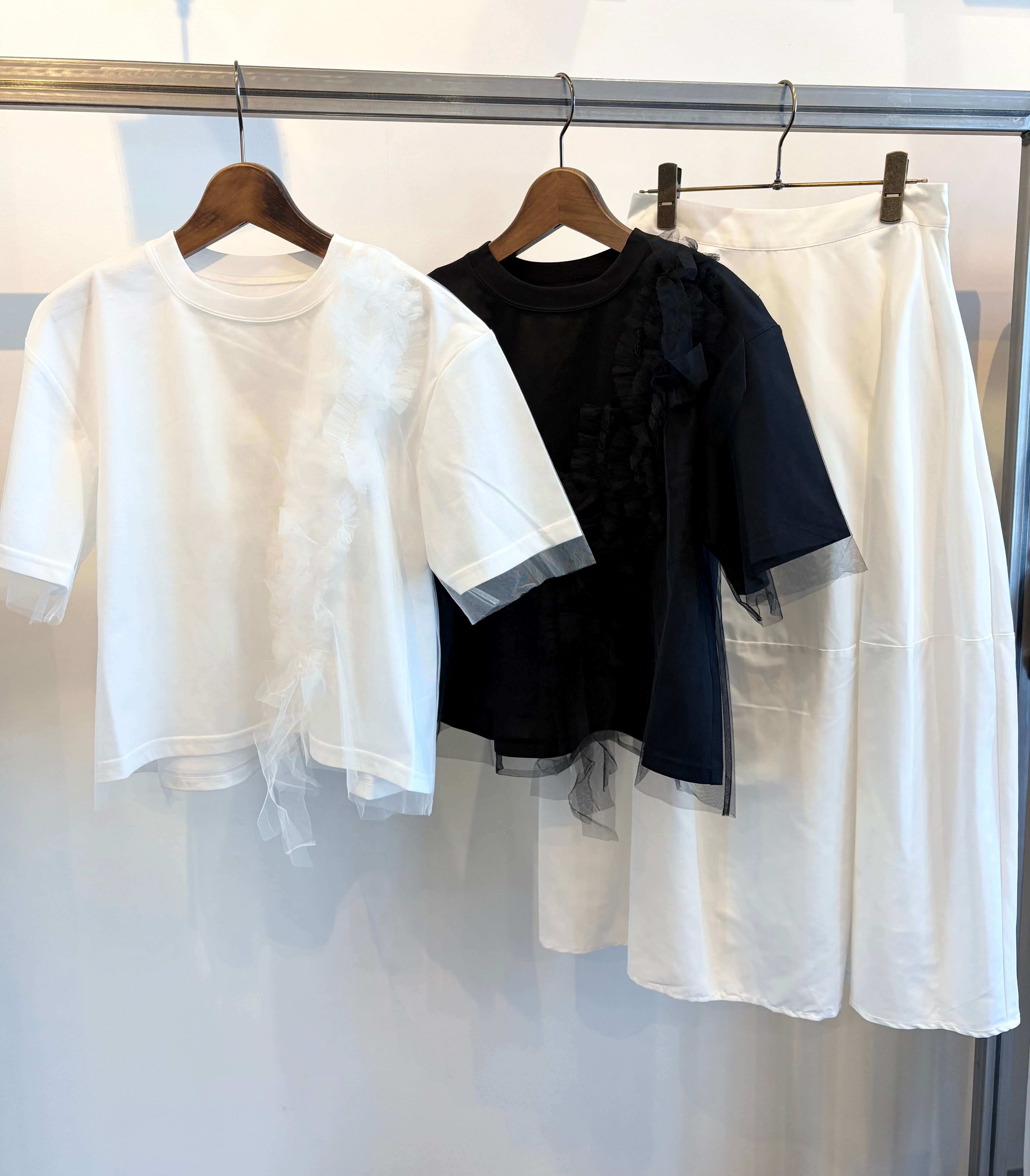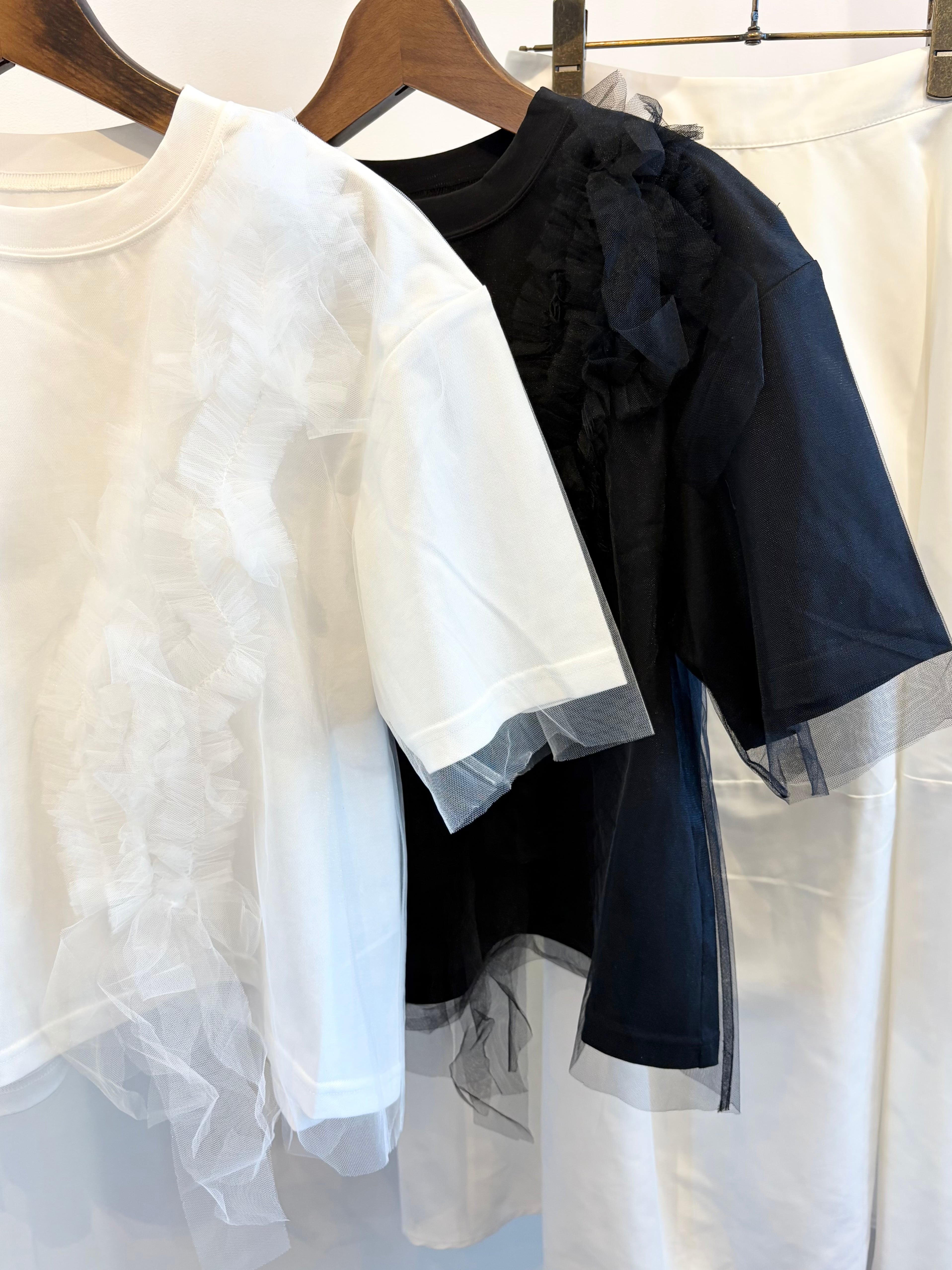 シンプルなカットソーに繊細で軽やかなチュールを重ねた、華やかさと抜け感のあるカットソー✨
