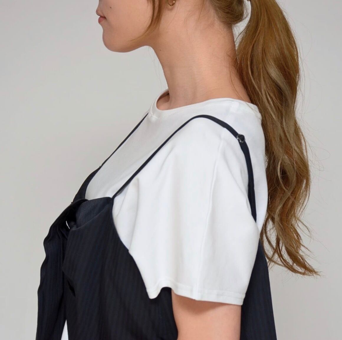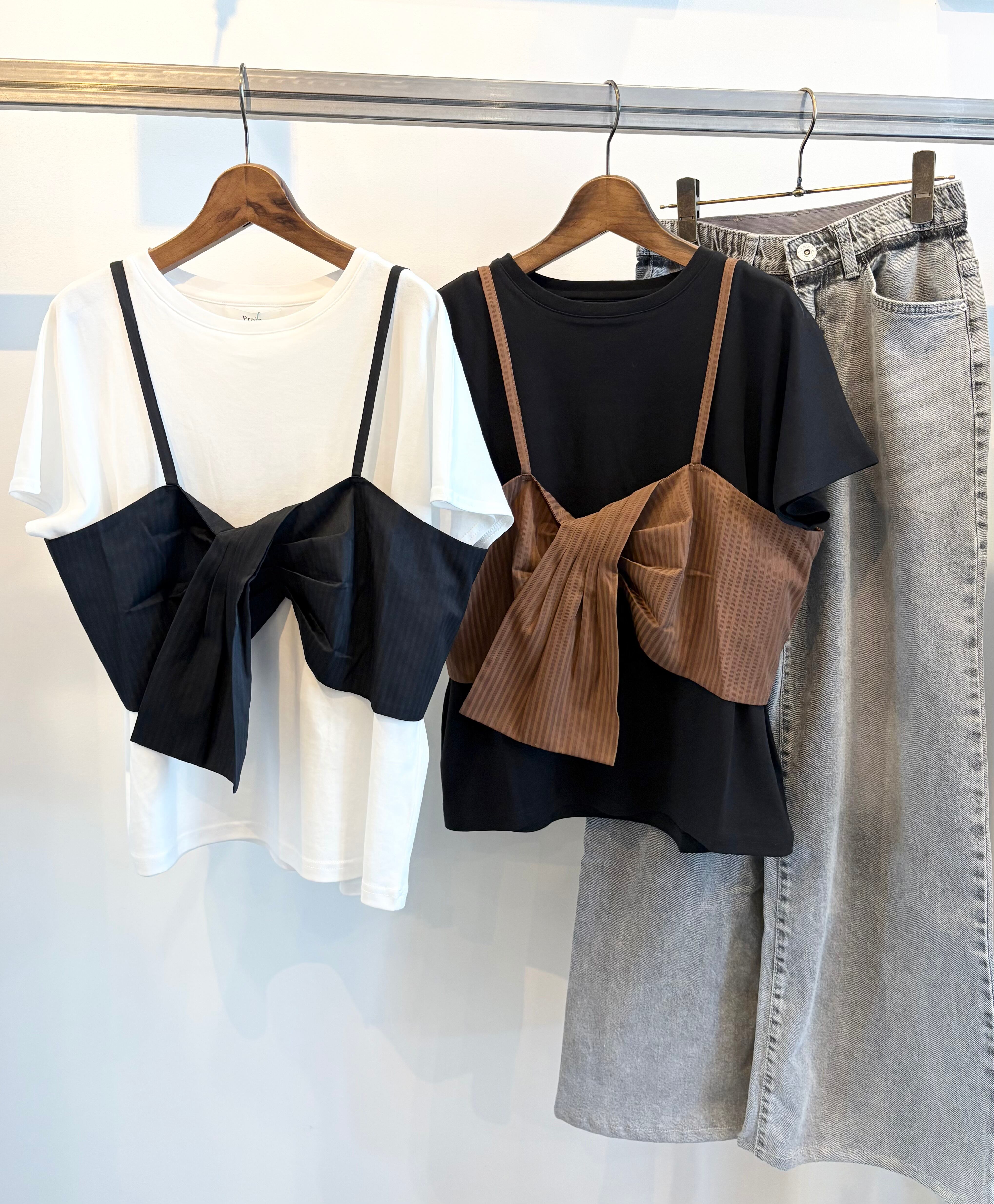 シャドーストライプ素材を使用したビスチェと、Tシャツ