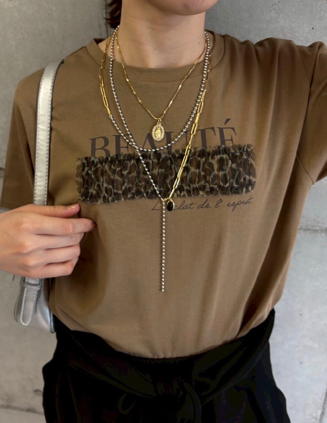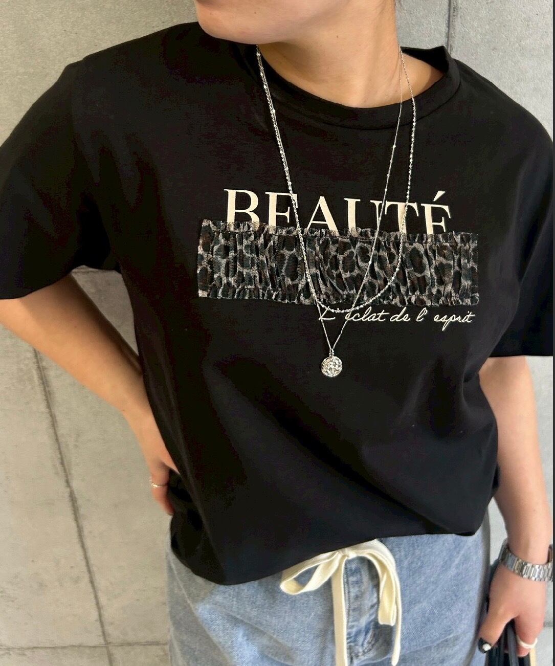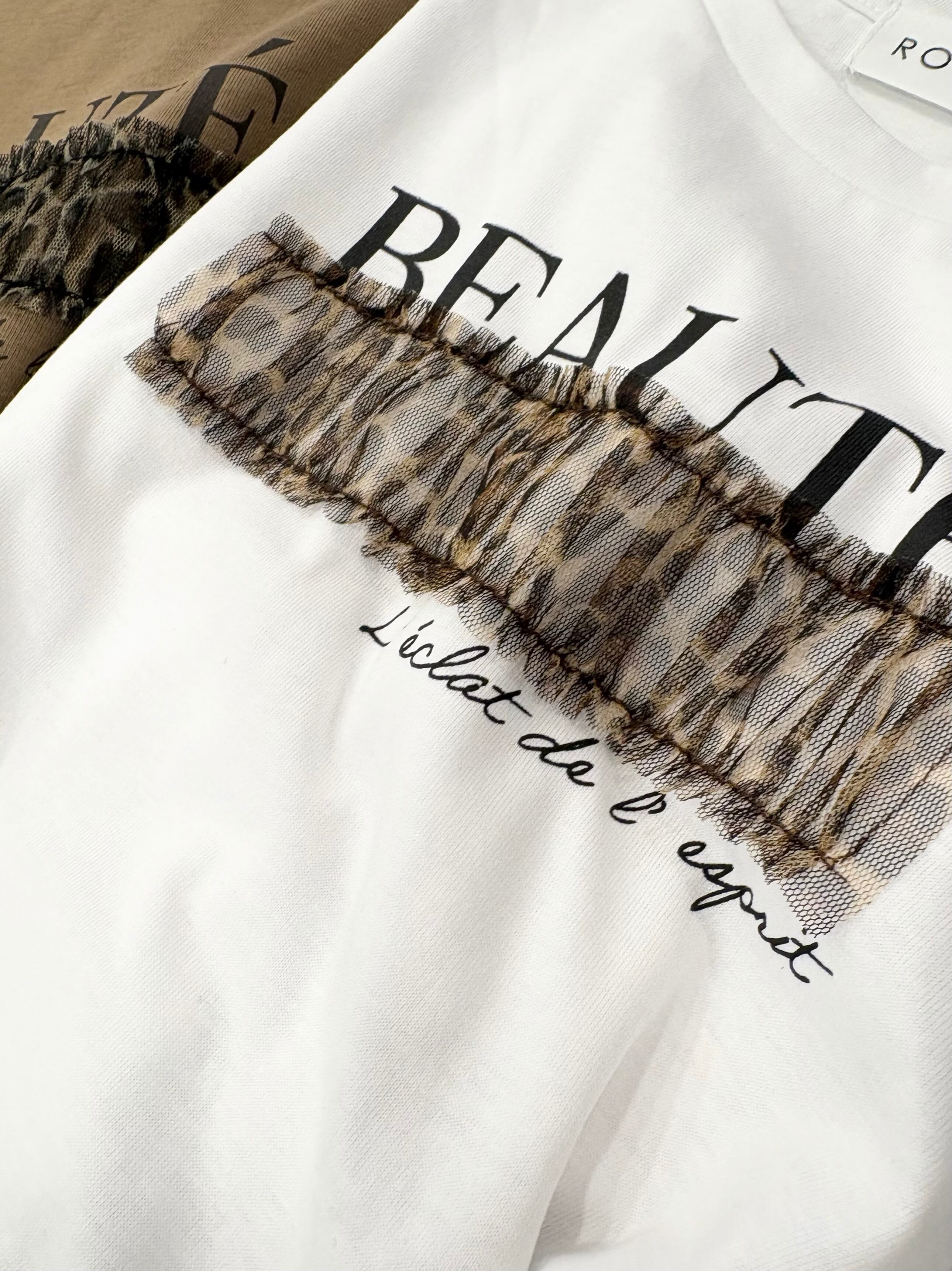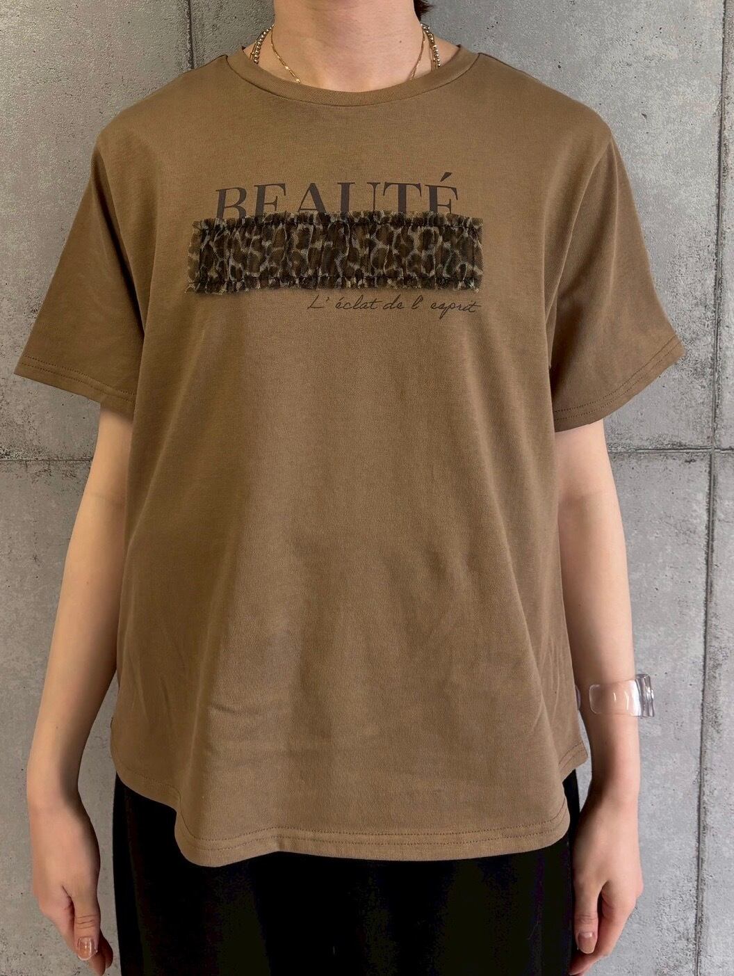 ロゴ部分にレオパードのチュールを重ねて縫いつけたデザインTシャツ✨